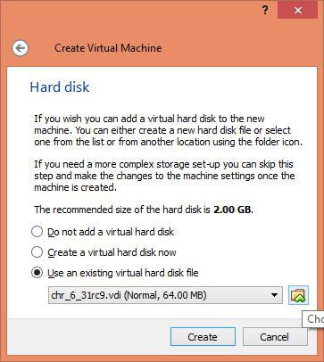 Kemudian tentukan kapsitas HDD (jika memakai wizard secara otomatis akan dialokasikan sebesar 2GB) dan juga tentukan file image yang telah kita download. Pilih browse (icon "folder") dan cari dimana file tersebut berada. Hal ini digunakan untuk media booting dari Virtual Machine. Jika sudah pilih "Create".