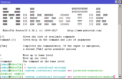 perintah CLI yaitu /system routerboard settings set protected-routerboot=enabled