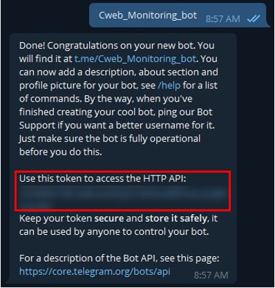 3. Setelah muncul respon seperti diatas kirimkan nama bot yang akan kita gunakan, sebagai contoh disini kita akan menggunakan nama : Cweb_Monitoring_bot. Jika pembuatan bot sudah berhasil akan muncul balasan yang mengirimkan token untuk mengakses API bot yang sebelumnya kita buat.