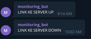 /tool fetch url="https://api.telegram.org/bot(TOKEN_BOT)/sendMessage?chat_id=(CHATID_BOT)&text=(PESAN KETIKA HOST UP)" keep-result=no Sedangkan script notifikasi ketika host down sebagai berikut : /tool fetch url="https://api.telegram.org/bot(TOKEN_BOT)/sendMessage?chat_id=(CHATID_BOT)&text=(PESAN KETIKA HOST DOWN)" keep-result=no