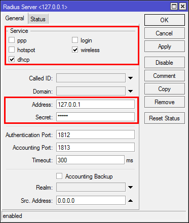 Pertama setting terlebih dahulu di sisi Router DHCP & Wireless sebagai Radius Client. Masuk ke menu "Radius". Centang opsi DHCP & Wireless, karena user DHCP dan user wireless yang nanti akan di-manage oleh UserManager. Pada opsi "Address", kita arahkan ke IP address perangkat router utama yang menjalankan service User Manager.