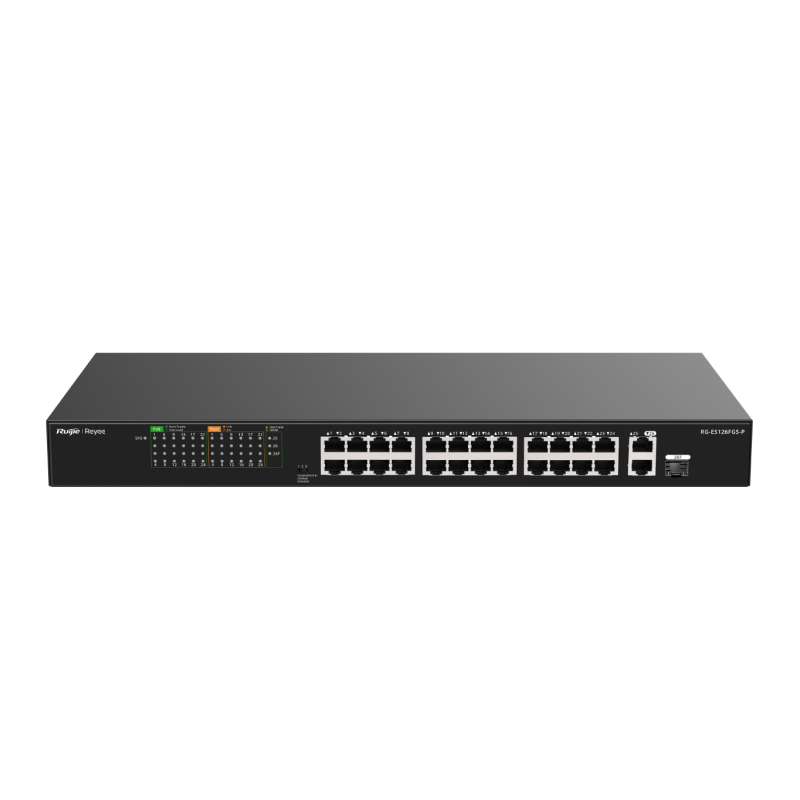 RG-ES126FGS-P with 24-Port 100Mbps + 1 Uplink Port 1000Mbps + 1 Gigabit RJ45/SFP combo Ports, 24 of the ports support PoE/PoE+ power supply. Max PoE power budget is 370W, Steel Case.