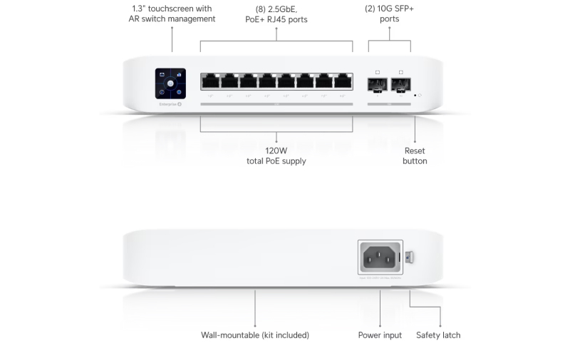 USW-Enterprise-8-PoE UniFi 8 port Layer 3 switch with 2.5 GbE PoE+ output.