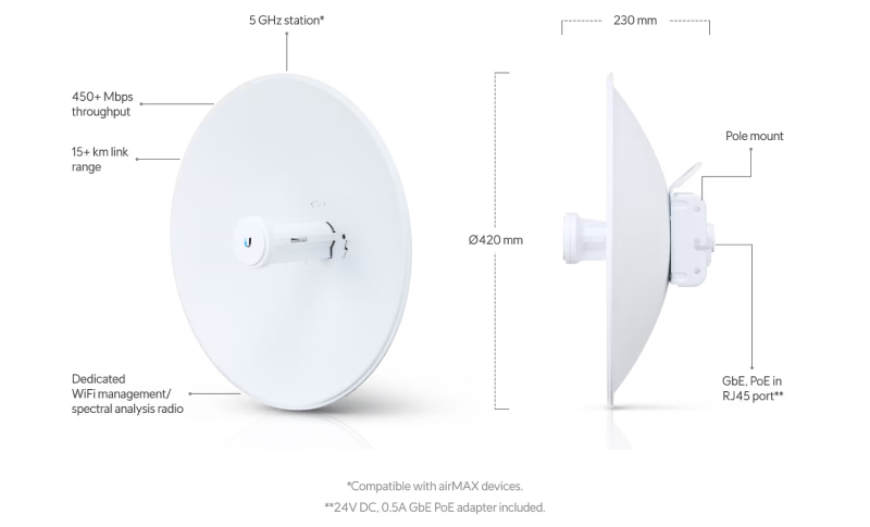 Ubiquiti PBE-5AC-Gen2 High-performance 5 GHz Point-to-Point (PtP) bridge with integrated dish reflector.