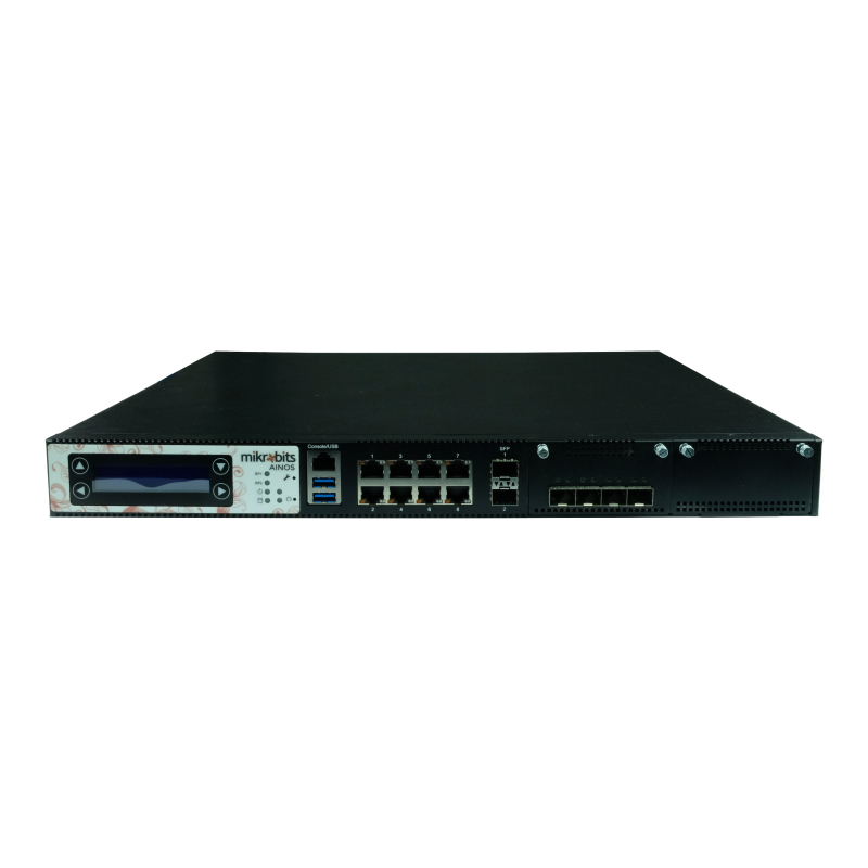 Mikrobits Ainos 1U rackmount Network Appliance yang berbasiskan prosesor Intel Core I3 Quad Core 3.2GHz. Dilengkapi dengan 8 port Intel gigabit ethernet, 2 port Intel 1G fiber SFP dan 4 port Intel 10G fiber SFP+.