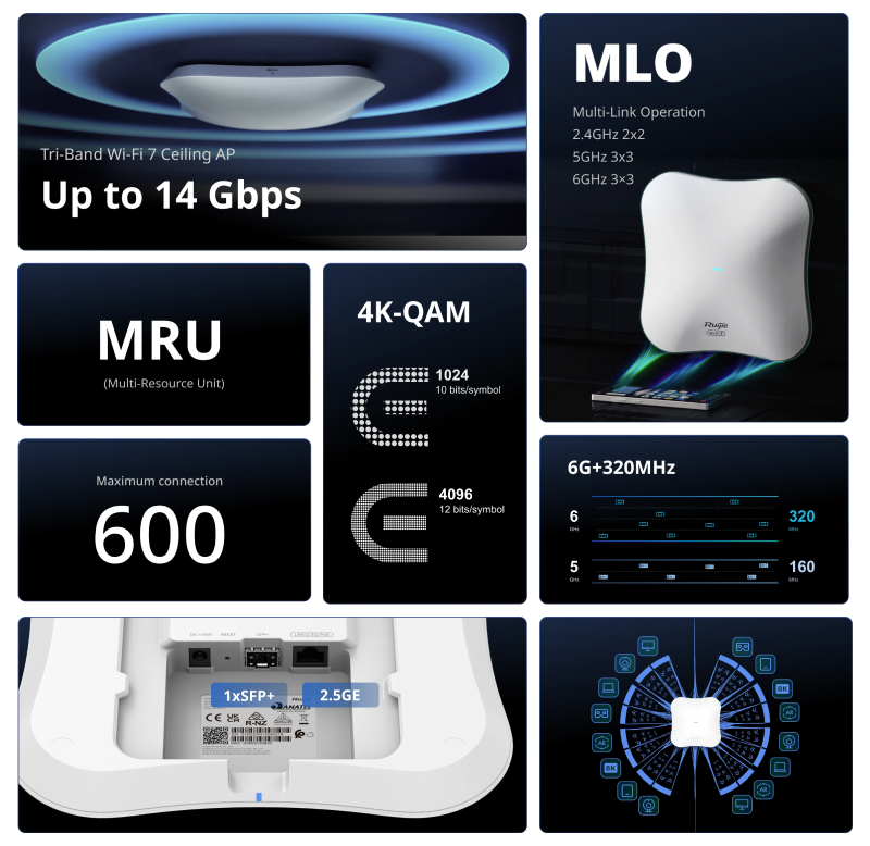 RG-RAP73Pro Wi-Fi7 BE14000 Tri-Band ceiling access point 2.4GHz/5GHz/6GHz dual-radio. High throughput dengan 8 spatial streams. Dilengkapi dengan 1x100/1000/2500 BASE-T Port (auto-negotiation), 1x1G/10GBASE-X SFP+ 10G Port, 802.11ax Protocol, support AP dan Routing Mode, support layer 2 dan layer 3 roaming.