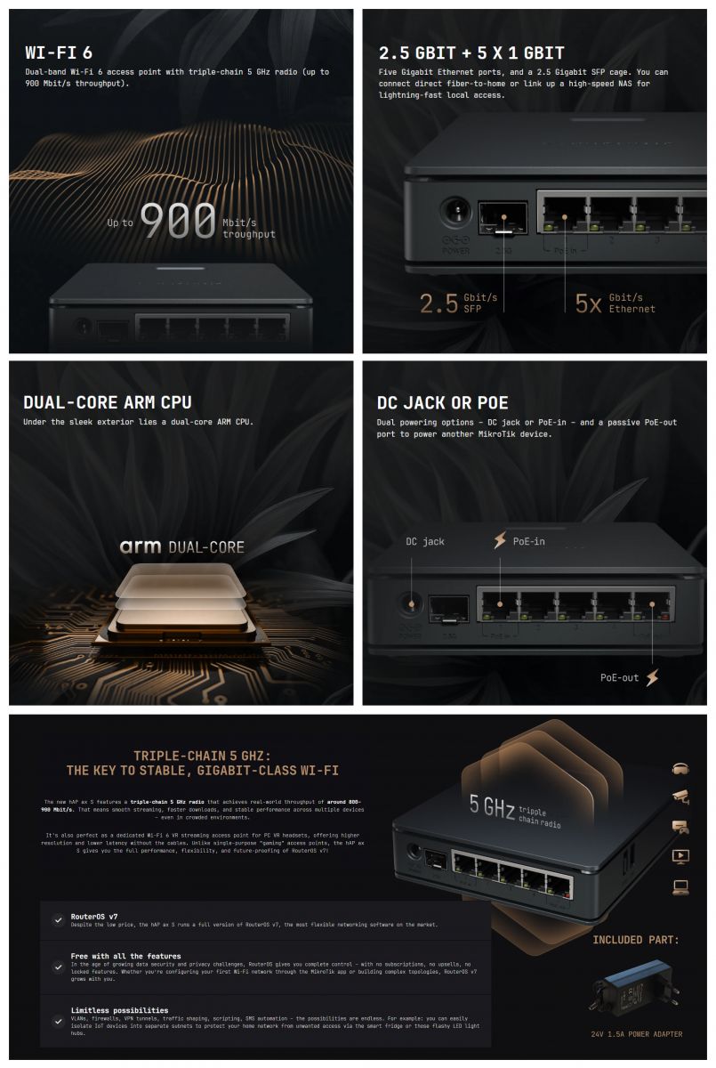 Mikrotik hAP ax S dilengkapi 5 GHz triple-chain yang mampu menghasilkan throughput sekitar 800–900 Mbps, sehingga menghadirkan streaming lebih lancar, download lebih cepat, dan koneksi stabil. Perangkat ini juga ideal digunakan sebagai access point Wi-Fi 6 untuk streaming VR dari PC, memberikan resolusi lebih tinggi dan latensi lebih rendah tanpa kabel. Berbeda dengan access point “gaming” biasa, hAP ax S menawarkan performa tinggi, fleksibilitas, serta dukungan RouterOS v7 yang siap untuk kebutuhan jaringan masa depan.