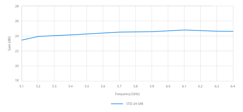 Antena StarterDish UM memberikan kinerja gain yang stabil di seluruh rentang frekuensi kerja dan pada kedua polarisasi. Gain yang stabil menghasilkan performa lapangan yang andal saat terjadi perubahan kanal radio.