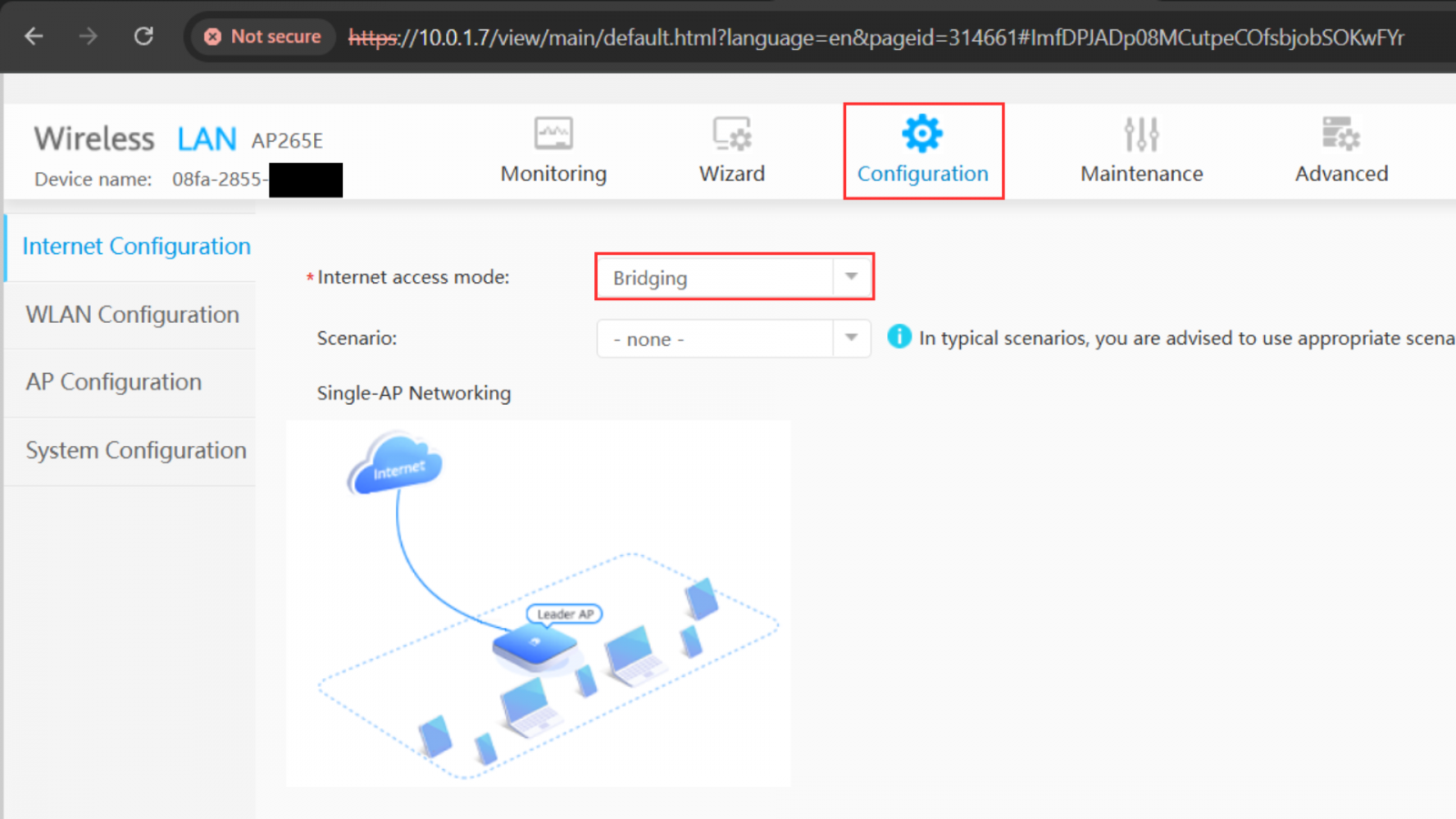 Kemudian masuk ke menu configuration >> internet configuration dapat dilihat, default konfigurasi fat mode di AP huawei adalah bridging. Dengan demikian IP yang didapatkan oleh laptop tetap satu segmen dan DHCP server nya berada pada router gateway.